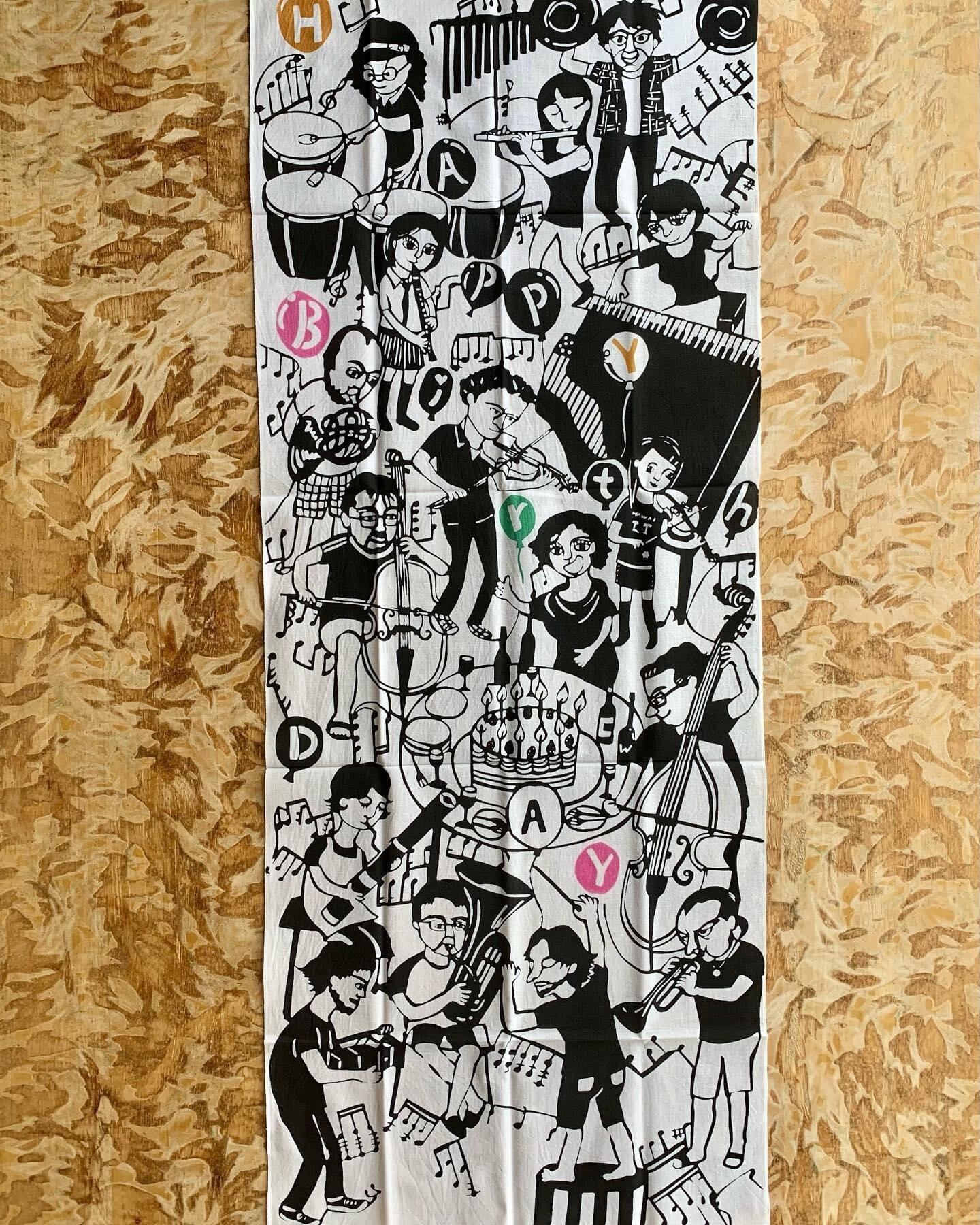 独特のタッチで描かれる版画家 工房カモさんの作品。ユーモアとパワーがあふれ、実用的な使い方はもちろん、タペストリーとして飾ってお楽しみ頂くのもおすすめです。