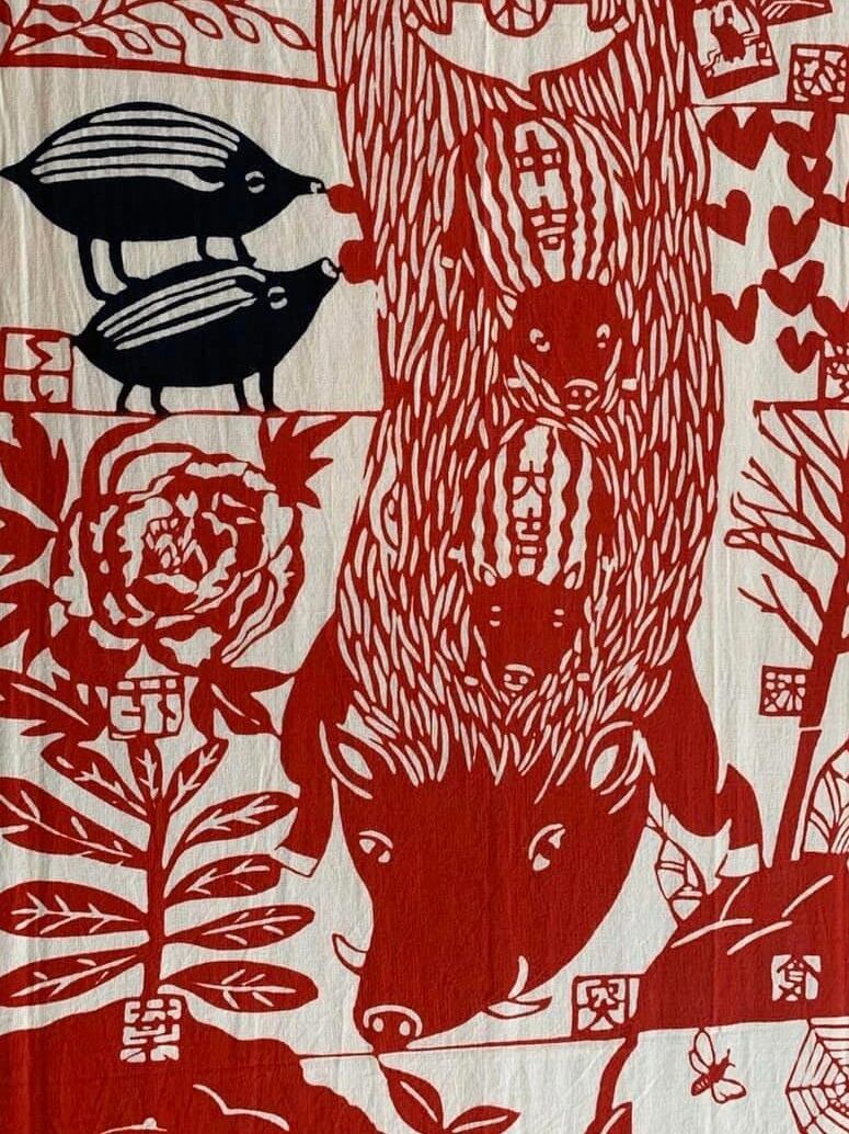 独特のタッチで描かれる版画家 工房カモさんの作品。ユーモアとパワーがあふれ、実用的な使い方はもちろん、タペストリーとして飾ってお楽しみ頂くのもおすすめです。