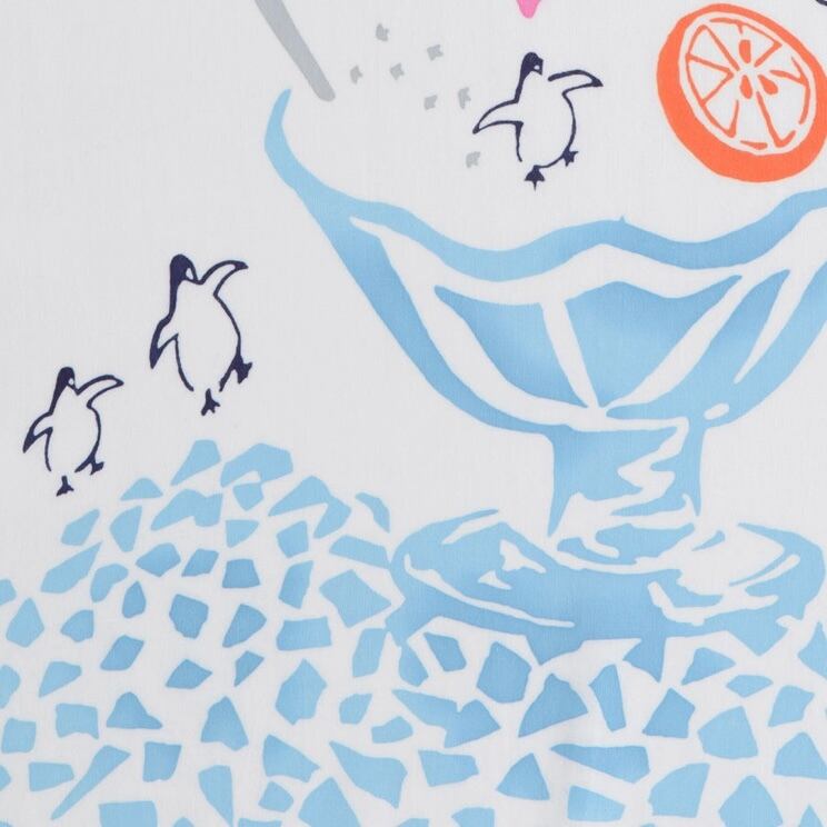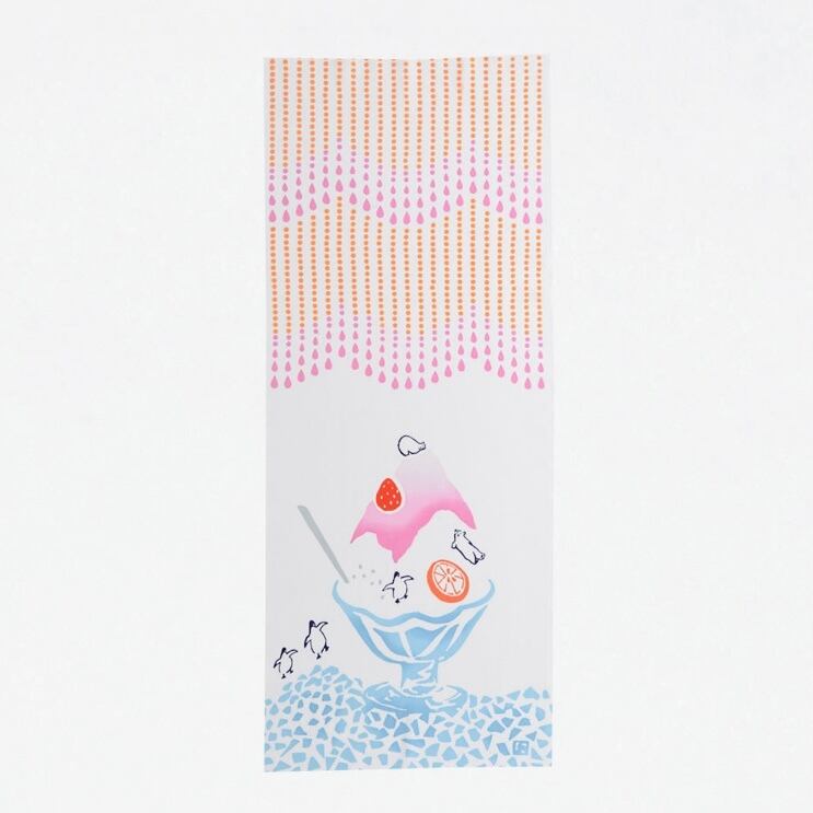 ひんやり冷たい氷の山に動物たちが集まって、ゆったりしたり遊んだり。注染ならでの「ぼかし技法」で染められた氷の山はまるで本当のシロップが、かかっているかの様な仕上がりです。暑い夏の日も楽しく過ごせそうな、お部屋飾りにぴったりな1枚です。