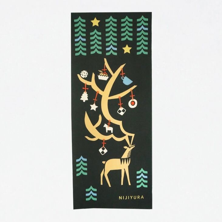 「Fika」それはスウェーデン語で「コーヒータイム」や「休憩」を意味し、家族や友人、仕事仲間などと美味しいお菓子やお茶を飲みながらおしゃべりをする寛ぎの時間を1日に何度もとる文化があります。そんなFikaの楽しい時間を運んできてくれるようなお菓子やコーヒーカップをぶら下げた鹿が印象的なデザインの手ぬぐいが仕上がりました。上部をカットするとティーマットとしてもお使いいただけるので、Fikaのお供に最適な1枚です。