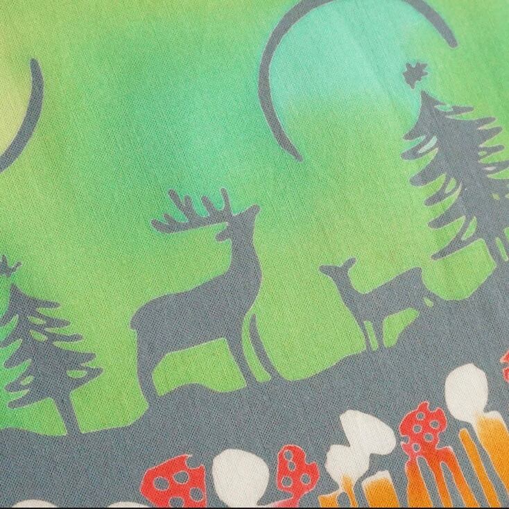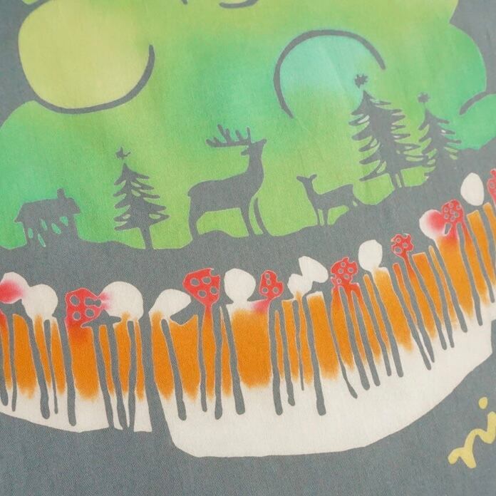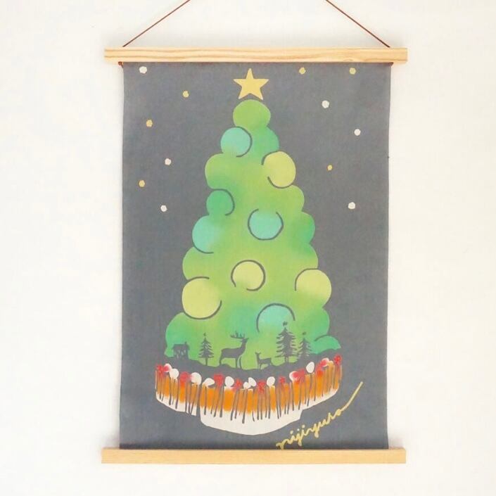 クリスマスの夜に、大きなツリーが届きました。澄んだ夜空を彩るように舞い降りたツリーは、注染のぼかしがぽわっと浮かぶ灯りのようにもみえます。そして大きなツリーの手前には、トナカイやもみの木、お家などが情景を物語っています。今宵はどんなクリスマスのストーリーが生まれているでしょうか。