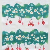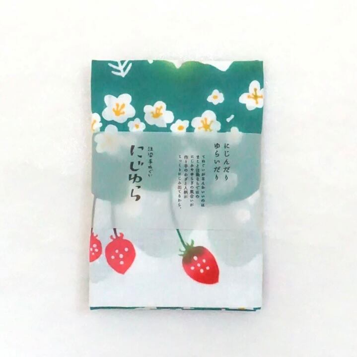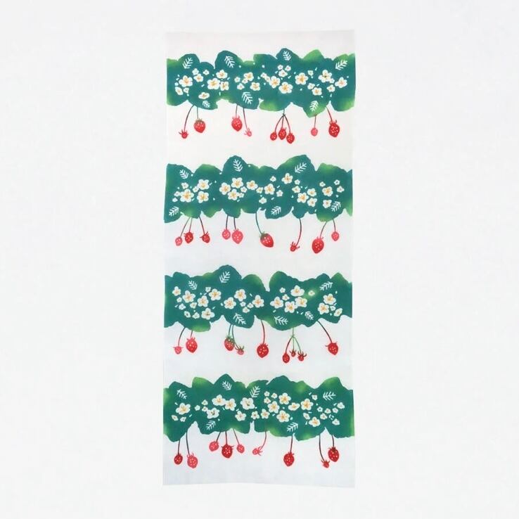 まっすぐに育まれたいちご畑。その中に足を踏み込むと甘い香りと可愛らしいいちごの装いに癒されます。たわわに実るいちごができる前に咲く白い花は、とっても可憐。その白い花をメインにデザインした手ぬぐいです。そして、時の流れを伝えるかのように実ったいちごも描き、いちご畑のボーダーにしました。いい香りが漂ってきそうな仕上がりになりました。