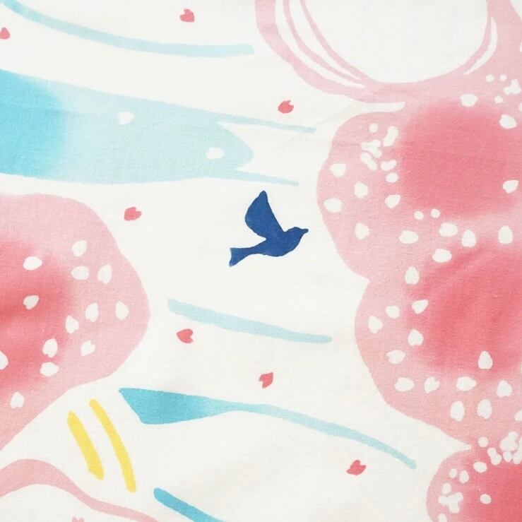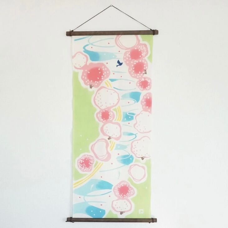 川辺に並ぶ並木道の春の暖かい様子を表現しました。ピンク色に染まった桜並木は、ほんわりと優しく懐かしいような想いをおこします。インテリアとしてタテでもヨコでもどちらで飾って季節を愛でることのできる手ぬぐいです。